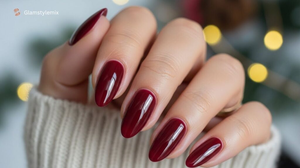 Garnet is a deep, romantic December nail color. Its rich red tone pairs beautifully with festive outfits and gold accessories. Many women in the USA choose garnet nails for holiday parties, dates, and winter evenings because it adds warmth and luxury to their look.