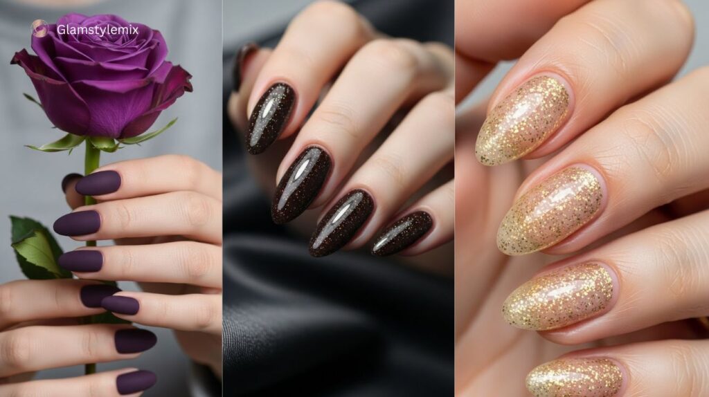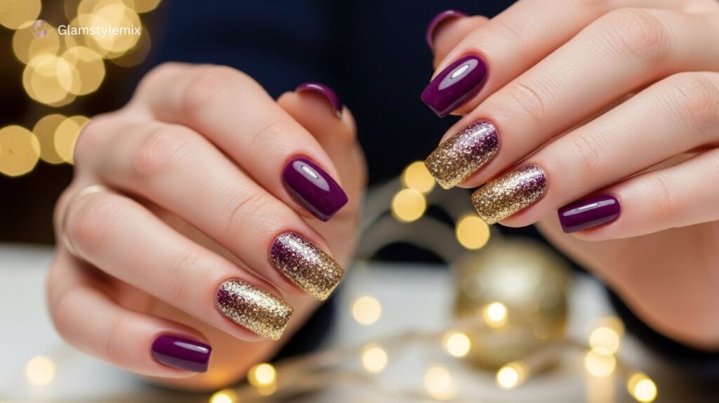 Matte finishes or glitter accents enhance deep purple nails for a modern touch. Studies show it is among the top December nail colors requested in the USA, highlighting its popularity during the holiday season.