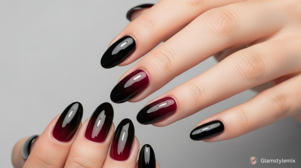 Reverse ombre flips the traditional style, starting with black at the cuticle and fading into burgundy near the tips. This creates a moodier, stronger effect perfect for fashion-forward personalities. It’s also a great style for shorter nails because the dark base visually elongates the nail.
