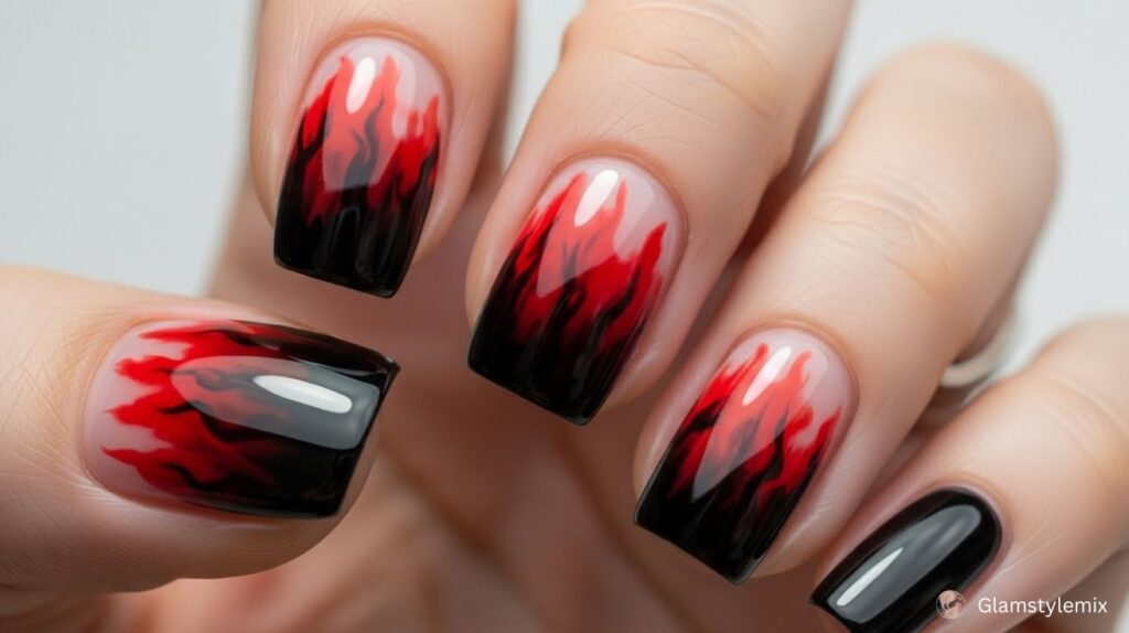 Your nail shape influences how your fiery nail designs and gradient transitions appear. Almond nails create soft elegance, while coffin nails make the blend look long and dramatic. Square nails highlight color contrast, and stiletto shapes create fierce silhouettes often used in scary stiletto ombre nails. The choice depends on lifestyle, comfort, and how much attention you want your nails to command.