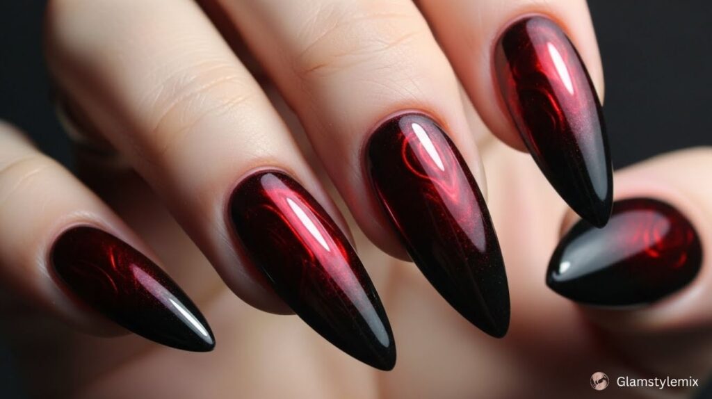 This style begins with a smooth gradient that blends deep red into pure black and ends with a reflective mirror topcoat that gives an almost glass-like surface. The mirror shine enhances the richness of the red and makes the black appear deeper and more dramatic. It’s one of the most loved designs in American nail salons because of its high-end appearance.