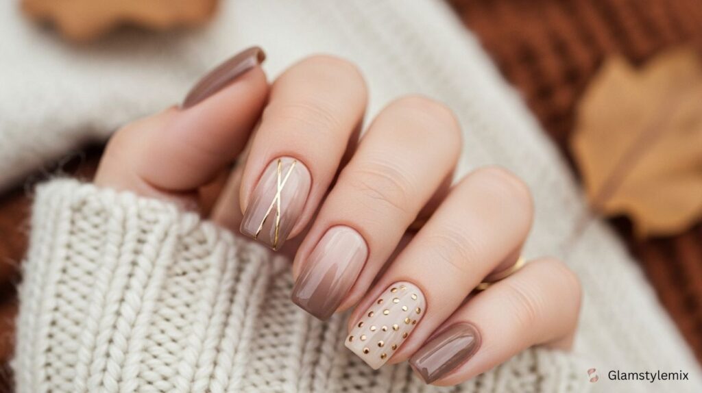 There’s a growing trend toward nails that feel like part of your wardrobe—not just an accessory. The neutral nail shades of beige and taupe evoke chunky knits and muted earth tones. On short fall nails, especially square shapes, this vibe becomes practical and refined. Think soft gradients, minimalist line art, or tiny metallic dots for texture.