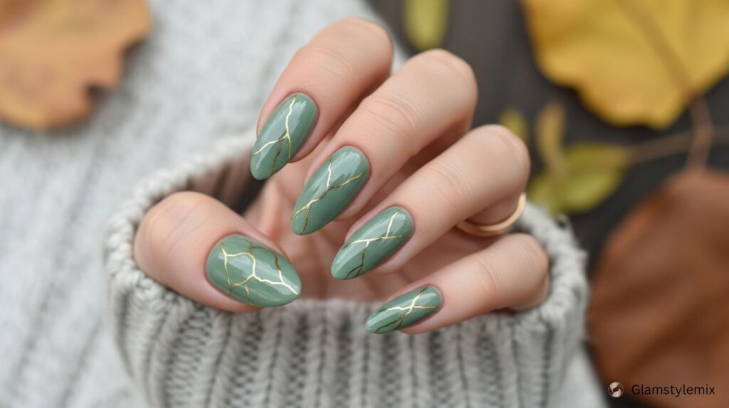 Green is no longer just for spring. The rise of sage green nails paired with luxe gold detailing signals a refined turn in autumn manicures. Imagine a mist-toned sage base and fine gold vein lines artfully drawn across nails—like nature and elegance merged. Use a metallic striping polish or foil fragments with a gel manicure at home to get this look.