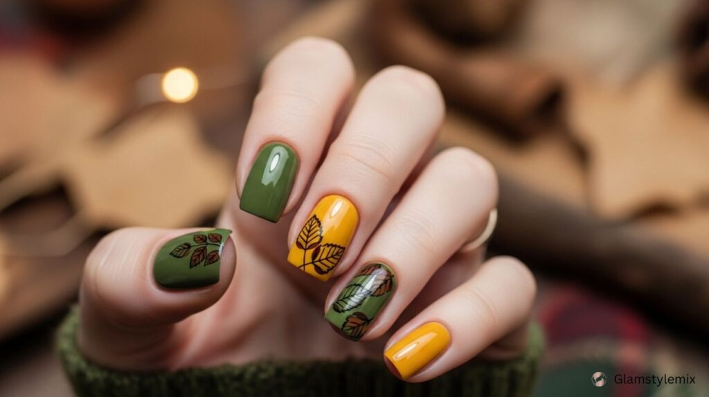 Forest green or deep olive nails paired with fine branch art or tiny leaf details bring nature indoors. These cozy fall nails draw inspiration from woodland walks and cabin getaways. Add nude or metallic accents for balance, and you’ve got a look that’s serene and refined.