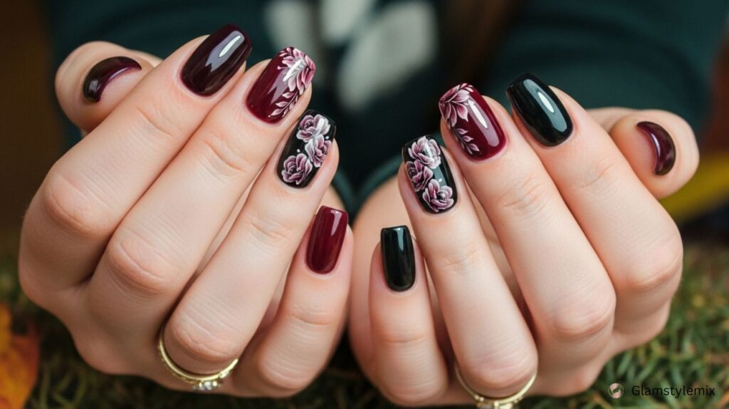 Dark and moody tones combined with floral touches make for a standout manicure. Burgundy nails, deep berry tips, or black bases with rose-pink blooms bring drama and elegance together. The floral nail designs add softness and detail, while the darker tones anchor your look in fall’s deeper palette.