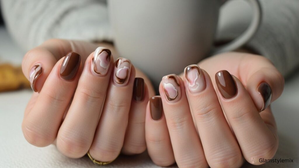 Marble effects and gradients are key expressions of artistry in Fall 2025 nail art inspiration. The blend of mocha brown nails with soft petal-toned gradients gives depth; the technique resembles swirling coffee and cream. Use a damp sponge to tap the gradient and then swirl with a fine brush for the marble effect. Marble nail art never truly goes out of style and feels especially fitting with warm autumn tones.