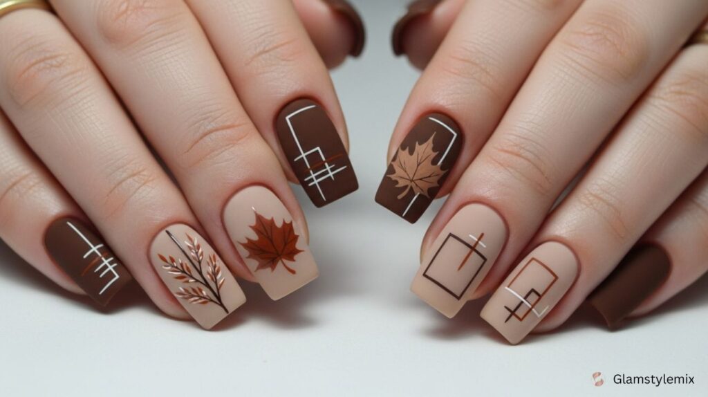 Matte finishes remain popular for the season because they feel understated and modern at once. Matte fall nails in chocolate brown, tan form a bold base for acrylic maple leaf designs or fine line art mimicking fall branches. Geometric autumn nails also fit here—think squares, rectangles or line work on square, short nails.