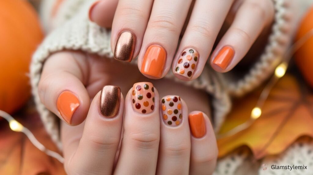 Nothing says autumn in the U.S. like pumpkin spice nails combining gentle orange with copper or bronze accents. Add playful touches with polka dot patterns in contrasting warm tones for a fun twist. These fall nail ideas for short nails bring a festive spirit but stay wearable.