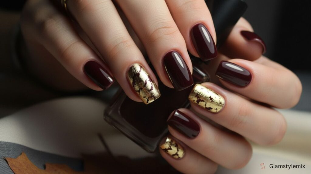 Rich and regal, burgundy nails layered with gold foil or leaf accents elevate your manicure game. The metallic leaf detailing adds dimension and luxury to the deep base. Use a foil application or fine gold leaf pieces for texture. This look transitions beautifully from day to night and fits both casual and formal fall settings.