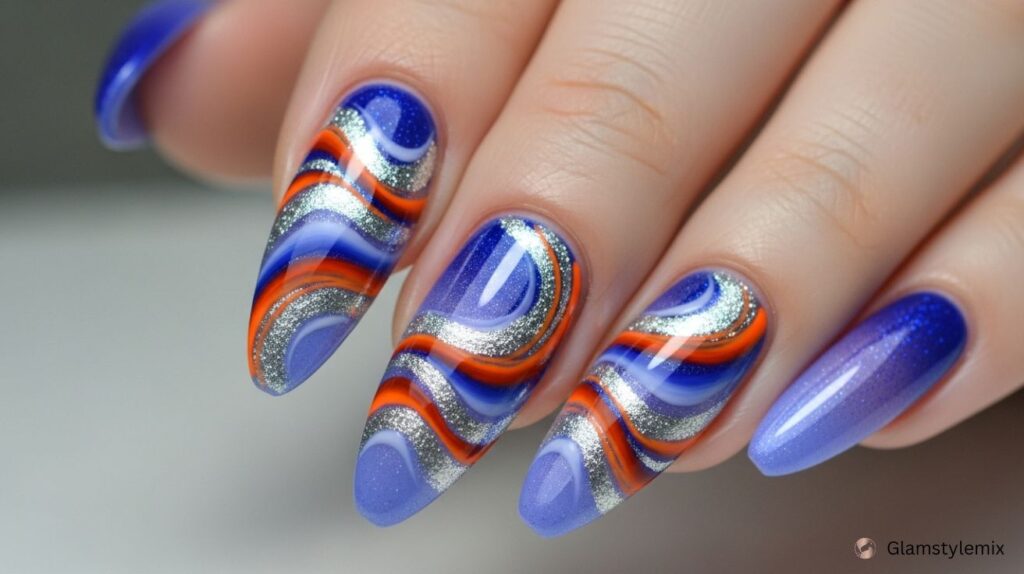 For those who like a twist on tradition, pairing unexpected colors and designs brings fresh energy. A deep cobalt or navy base with silver wave accents or swirl art gives you an editorial-style manicure. These stylish autumn manicures feel modern and bold while still referencing the sunset and metallic finishes of the season.