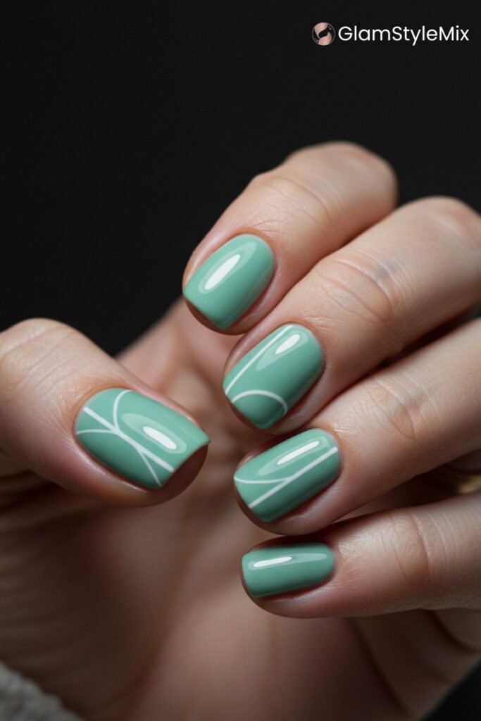 On three of the nails—the thumb, the middle, and the ring finger—there are thin white lines drawn over the green. These lines are simple and curved, almost like the veins of a leaf or a very basic abstract drawing. This is a smart way to add a bit of personality to a manicure without making it look messy or cluttered. By only putting the art on a few fingers instead of all of them, the look stays balanced and neat. It shows that you can make a simple set of nails look much more expensive and custom just by adding a few well-placed details that catch the eye.