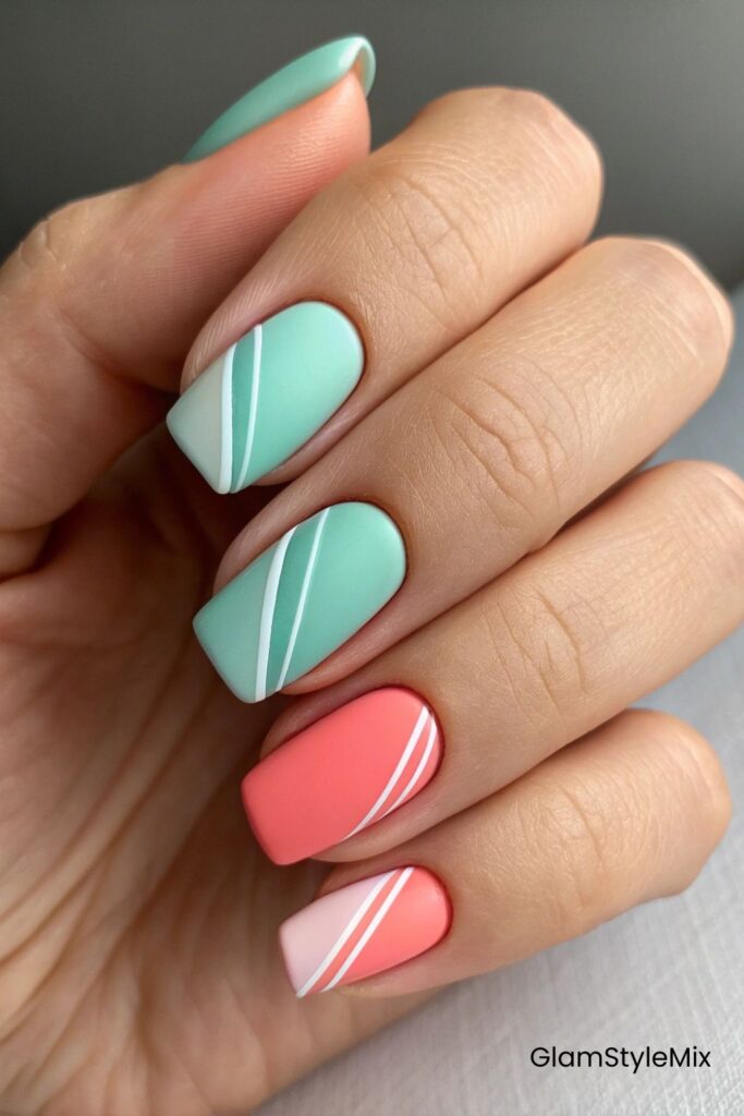 This nail design shows a calm and friendly style. The nails are painted in gentle green, peach, and light pink shades. Each nail has a neat white stripe that adds a clean pattern to the look. The colors feel fresh, simple, and pleasant to see. This design feels easy to wear in everyday life, but it also looks neat enough for special moments. It has a smooth matte finish which makes the colors look soft instead of shiny.