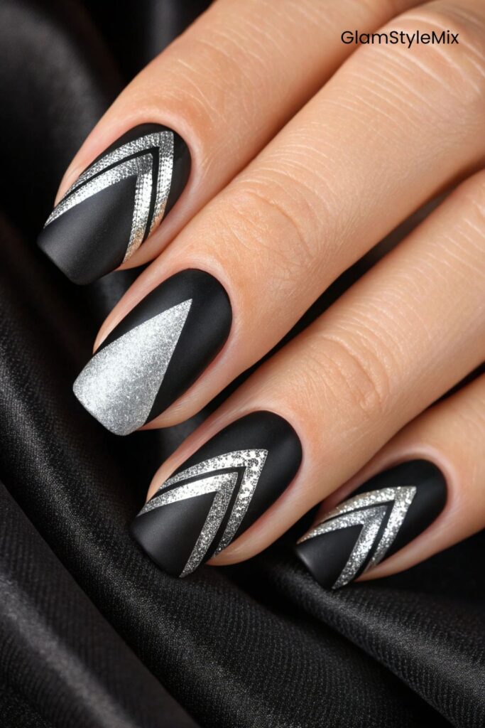 This nail design has a bold and confident look. The nails are mostly black, but they have silver shapes and lines that add strength and character. The matte black surface makes the silver stand out even more. Some nails have arrow-shaped designs, while one has a silver triangle that catches attention. The design feels sharp, clear, and straight to the point.