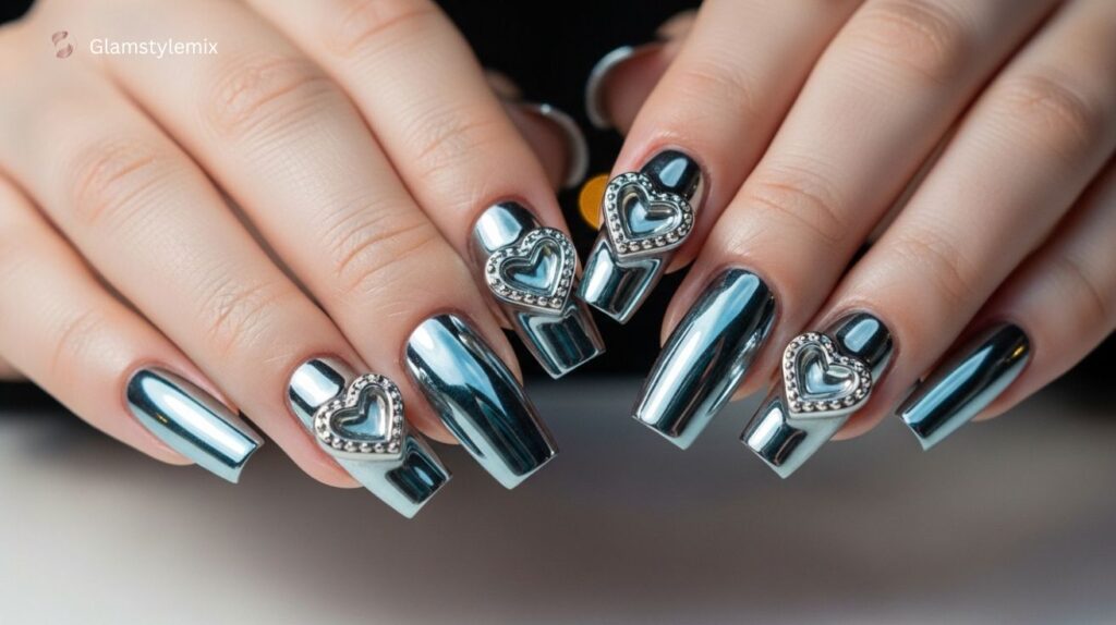 If you want a futuristic look, chrome pigments are the way to go. Adding 3D nail charms in the shape of hearts over a metallic base creates a striking, high-tech vibe. These reflective nail designs catch every bit of light and look amazing in evening settings.