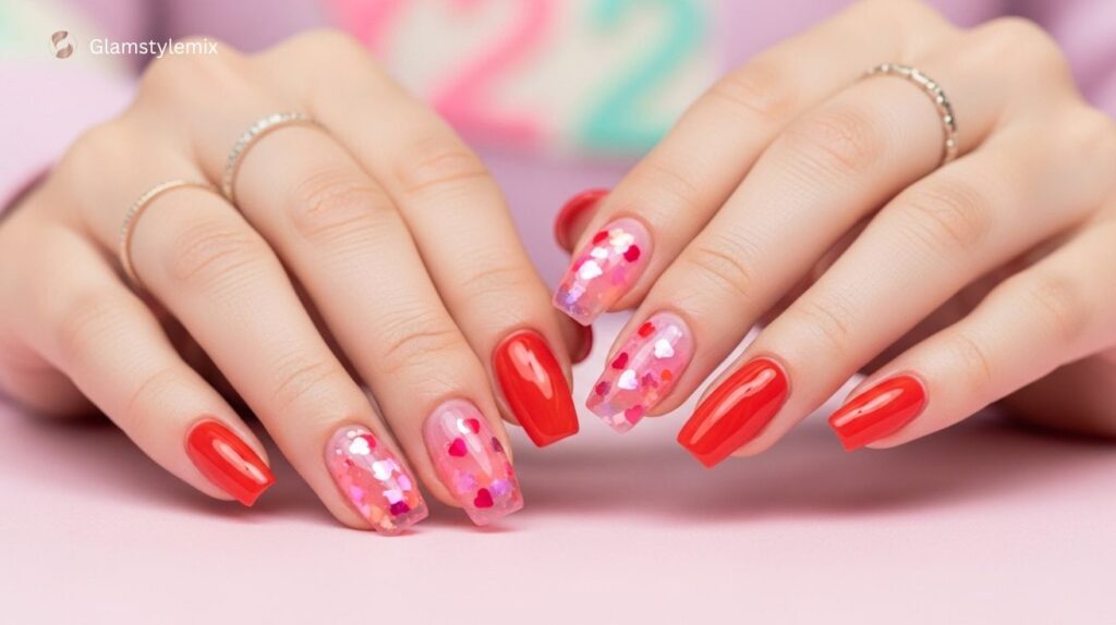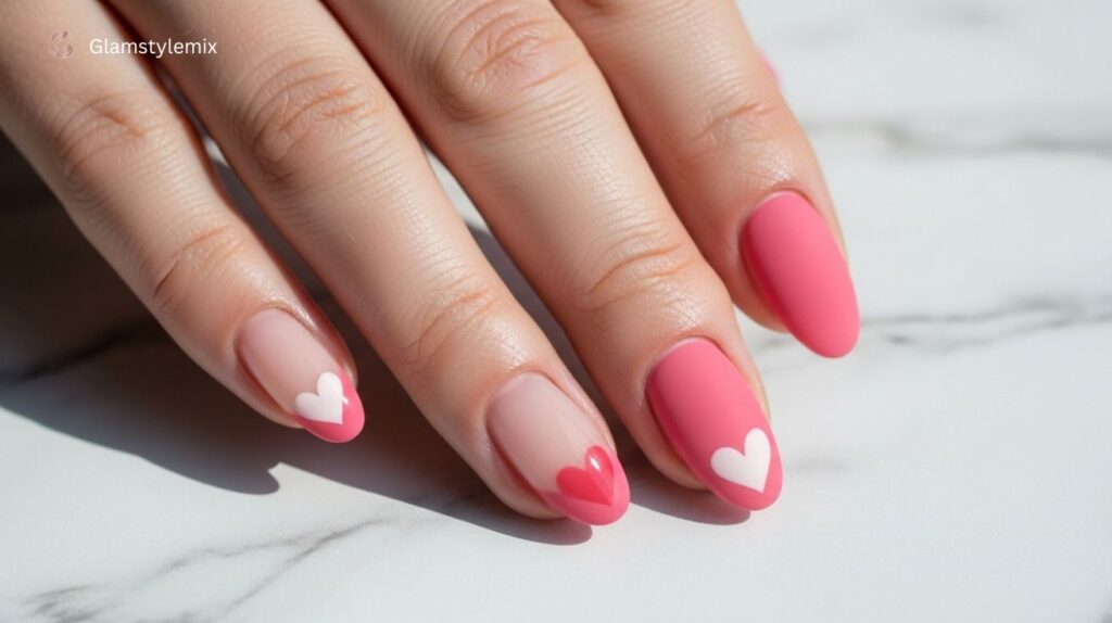 Inverted hearts are placed at the base of the nail rather than the tip. This negative space technique is very popular because it allows your natural nails to show through. It’s a clever twist on traditional Valentine’s Day nail ideas that feel very architectural and fresh.